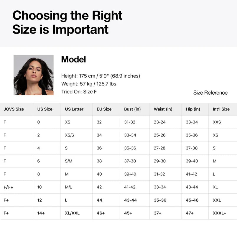 | JOVS Size | US Size | US Letter | EU Size | Bust (in) | Waist (in) | Int'l Size | Hip (in) |
